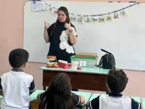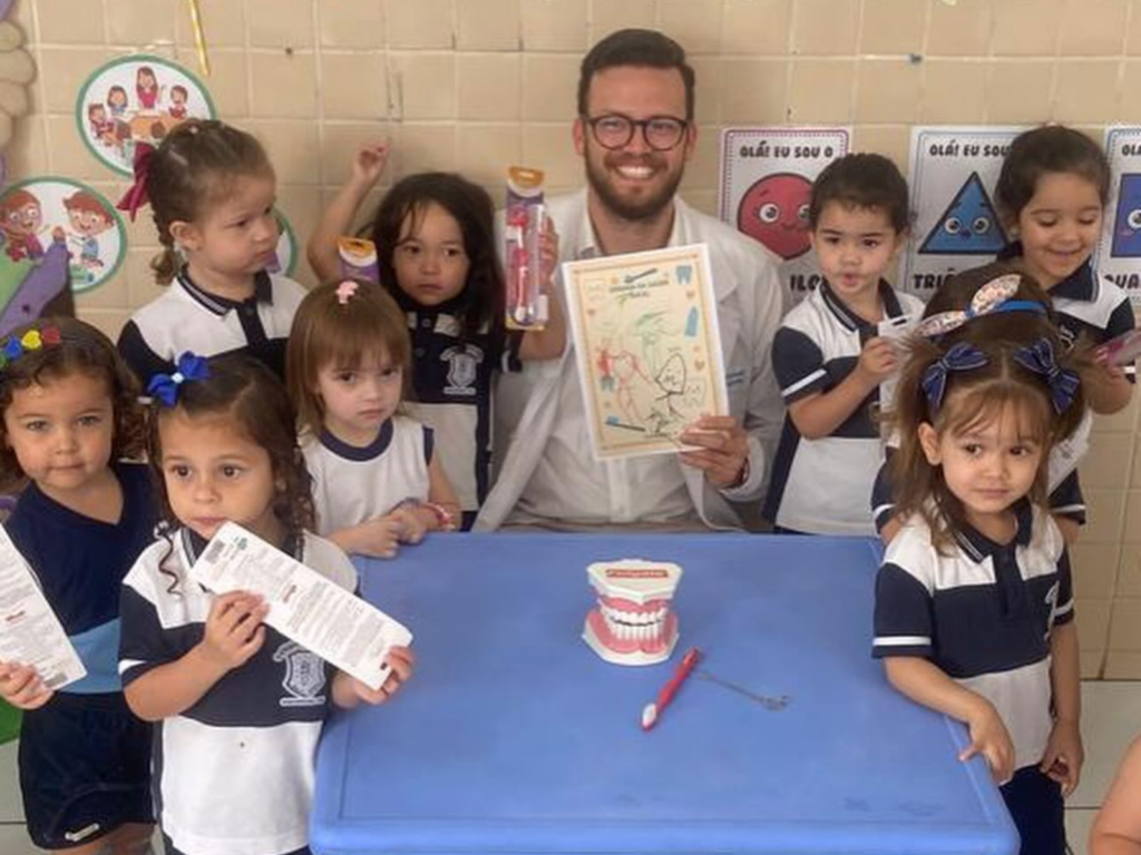 Cada turma recebeu orientações sobre cuidados e higiene bucal, reforçando a importância de manter a saúde dos dentes em dia, com aulas explicativas, exemplos práticos e sorrisos constantes.