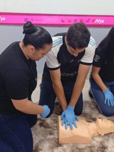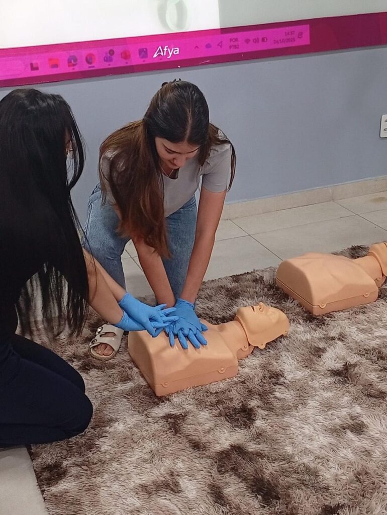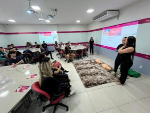 Durante a visita, os alunos participaram de um treinamento didático, no qual os universitários demonstraram técnicas de primeiros socorros. Sob supervisão, os estudantes do Santa Sofia puderam praticar algumas manobras em manequins, uma experiência enriquecedora, que envolveu tanto o conhecimento técnico quanto a segurança necessária para lidar com situações de emergência.