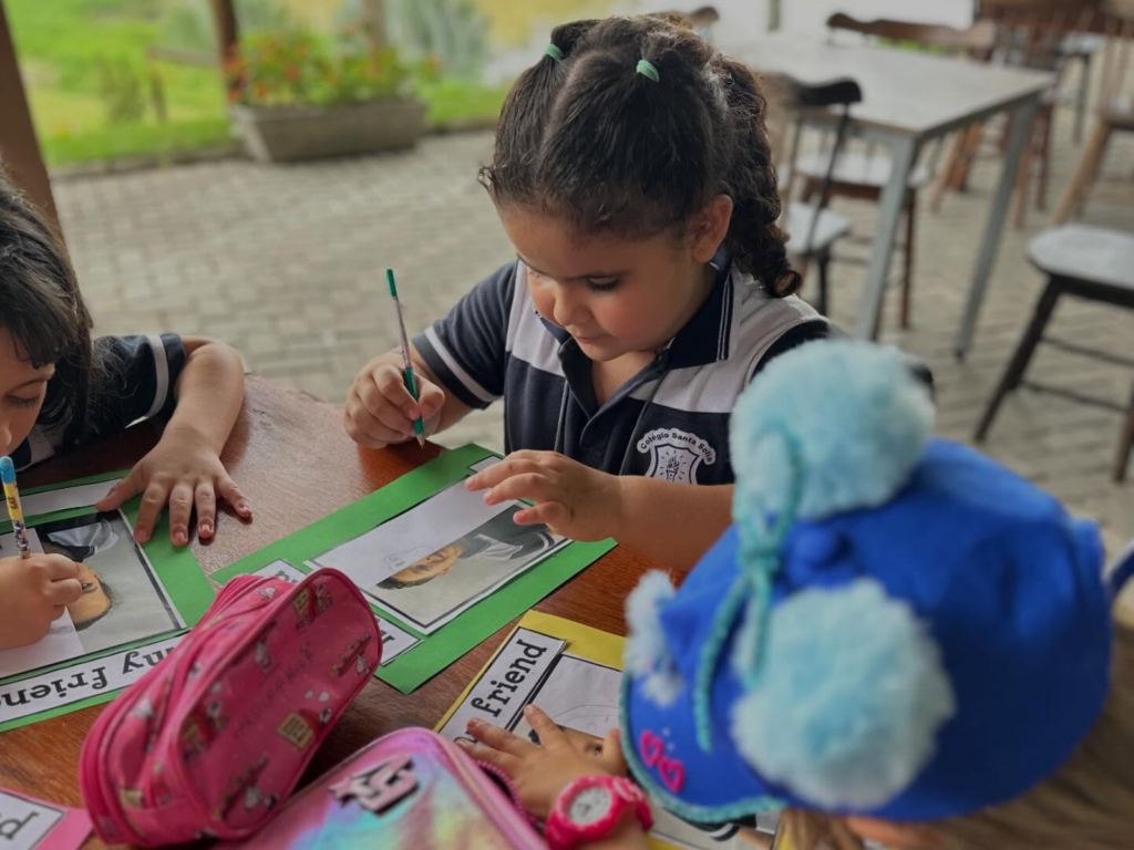 Durante o encontro, as crianças participaram de atividades interativas conduzidas em inglês, explorando o idioma de forma natural e significativa. A proposta buscou estimular a comunicação, ampliar o vocabulário e reforçar conteúdos trabalhados em sala de aula, aproximando o aprendizado do cotidiano dos estudantes.